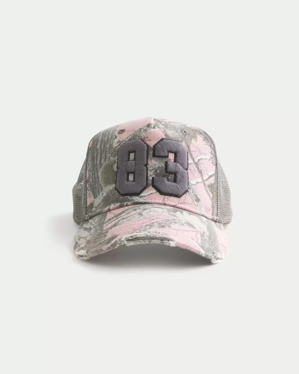 En klassisk hatt i lastbilsstil med meshbaksida och rosa camomönster framtill. Nummer grafisk applikation, distressed detaljer, justerbar. Importerad.