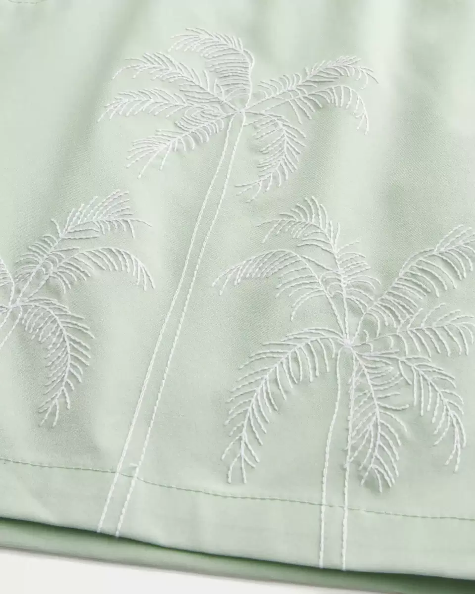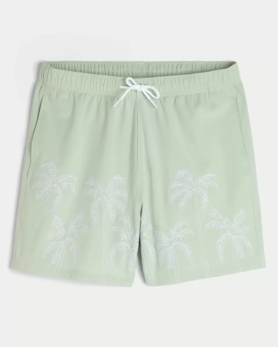 Kortare badbyxor som träffar mitten av låret. Med bekvämt 4-vägs stretchigt simtyg och en 5,5″ innersöm. Fickor, broderad palmgrafik. Importerad.