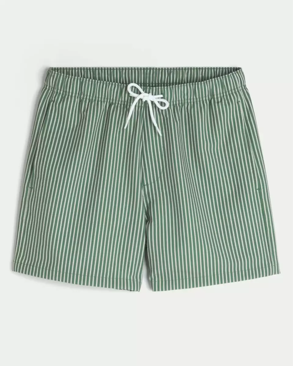 Kortare badbyxor som träffar mitten av låret. Med bekvämt 4-vägs stretch seersucker simtyg och en 5,5″ innersöm. Fickor fram, meshfoder. Importerad.