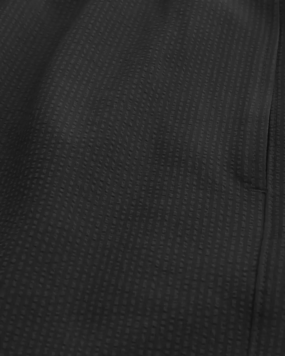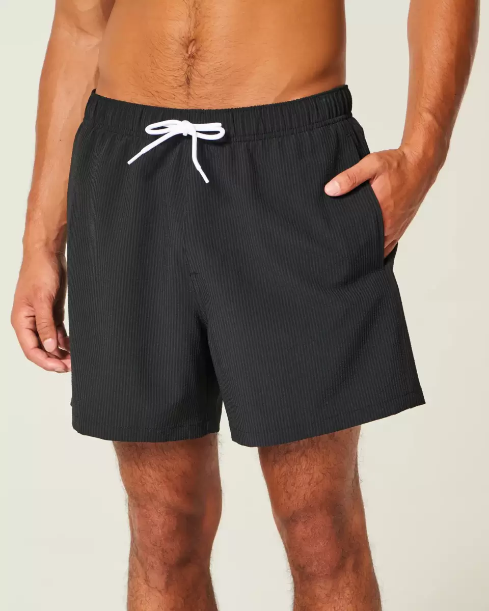 Kortare badbyxor som träffar mitten av låret. Med bekvämt 4-vägs stretch seersucker simtyg och en 5,5″ innersöm. Fickor fram, meshfoder. Importerad.
