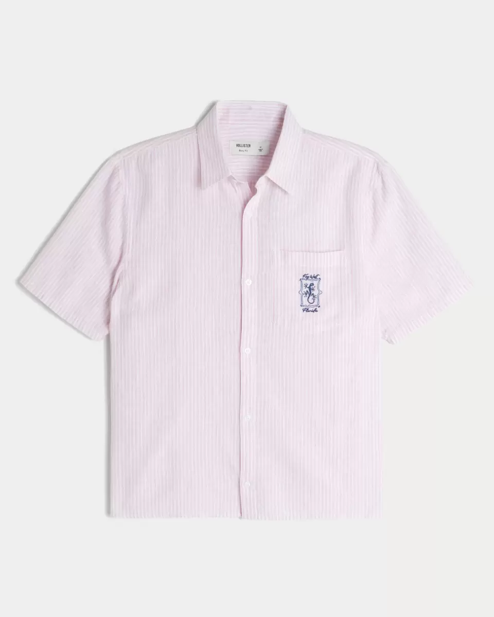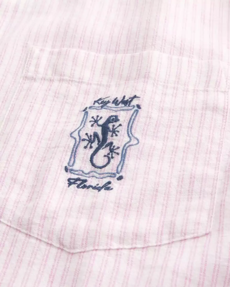 Den här klassiska skjortan är gjord i en mjuk linneblandning och har Key West Florida grafiska broderier på vänster bröstficka. Lägerkrage, korta ärmar, hel knappstängning. Boxig passform. Importerad.