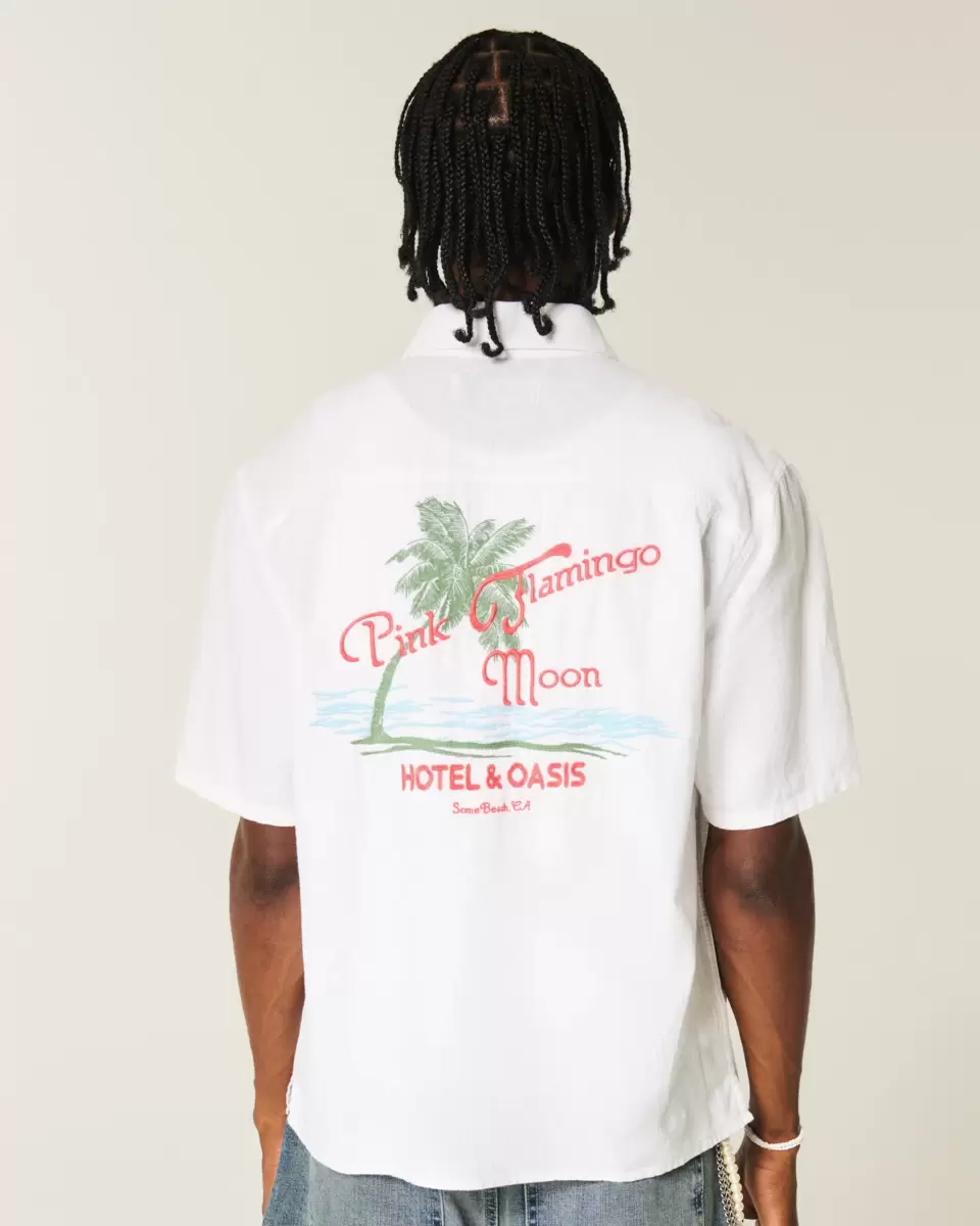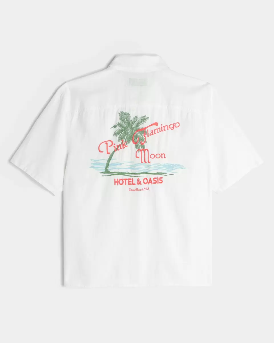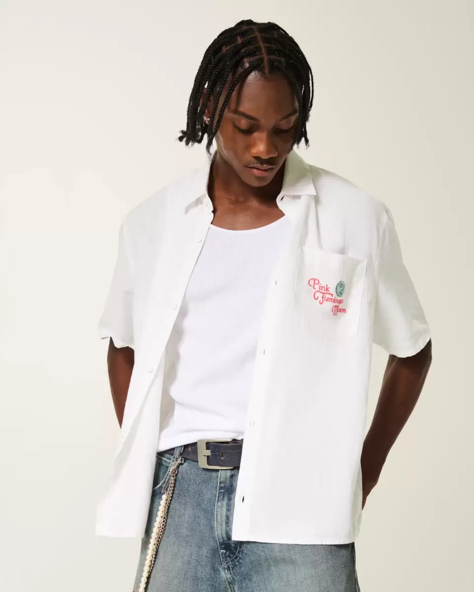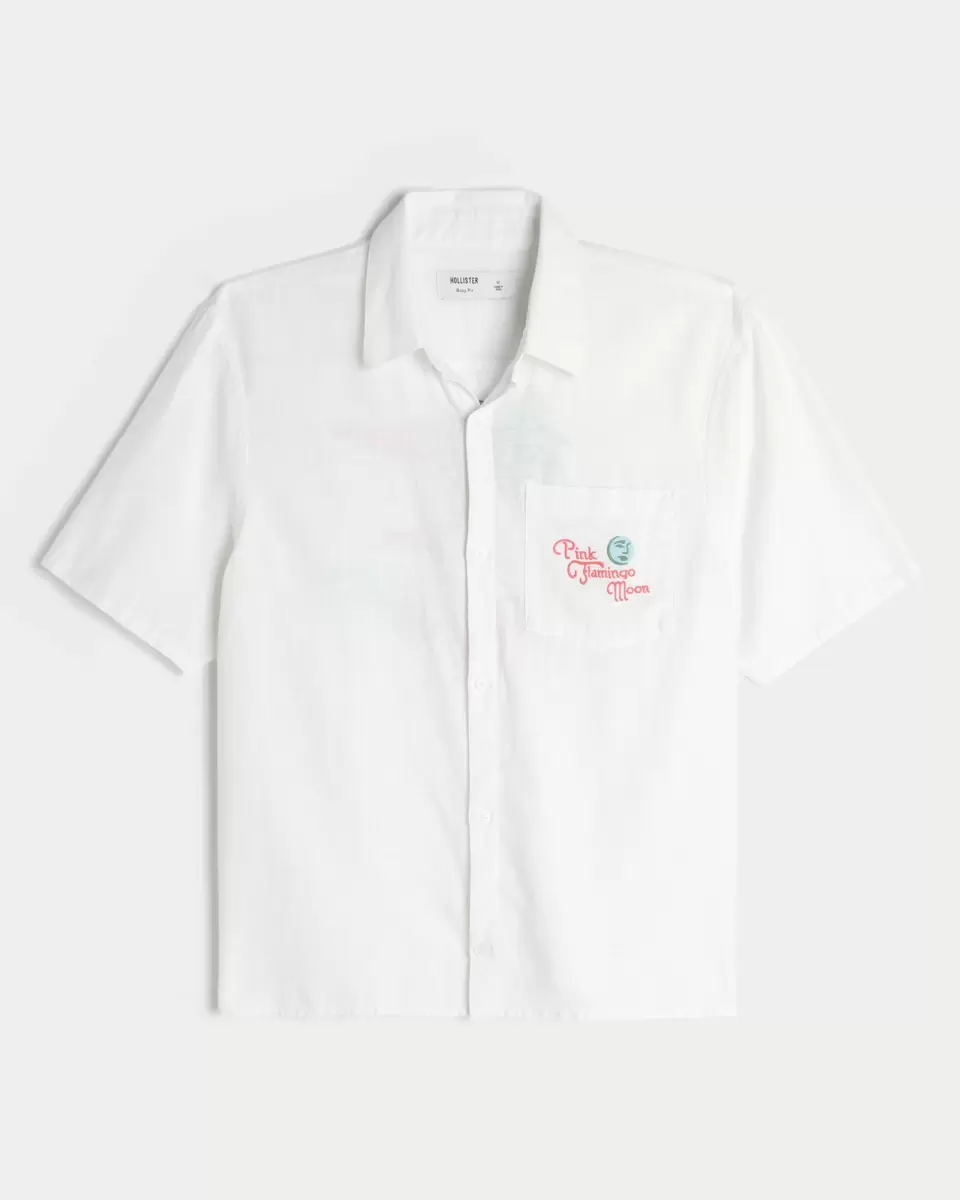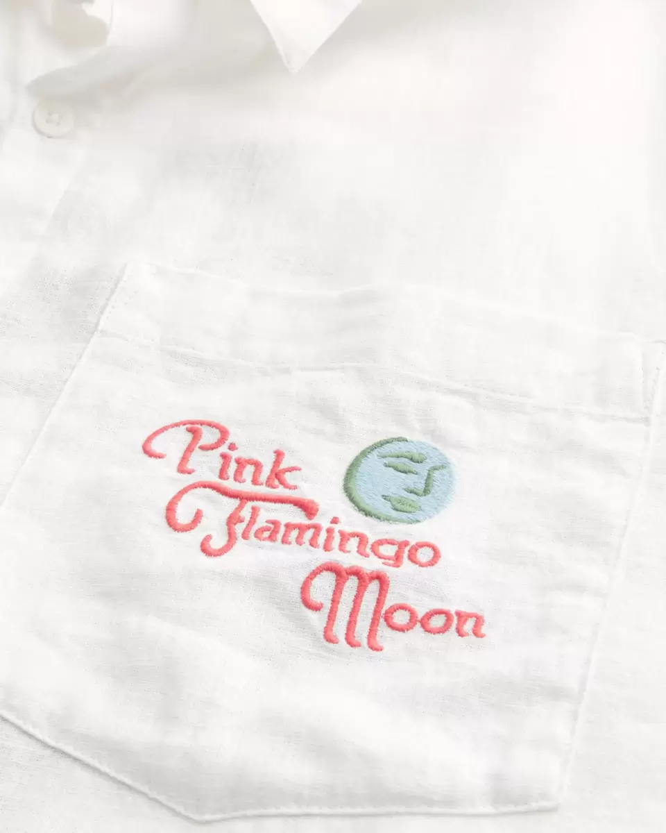 Denna klassiska skjortan är gjord i en mjuk linneblandning och har Pink Flamingo Moon grafiskt broderi på vänster bröstficka och bak. Lägerkrage, korta ärmar, hel knappstängning. Boxig passform. Importerad.