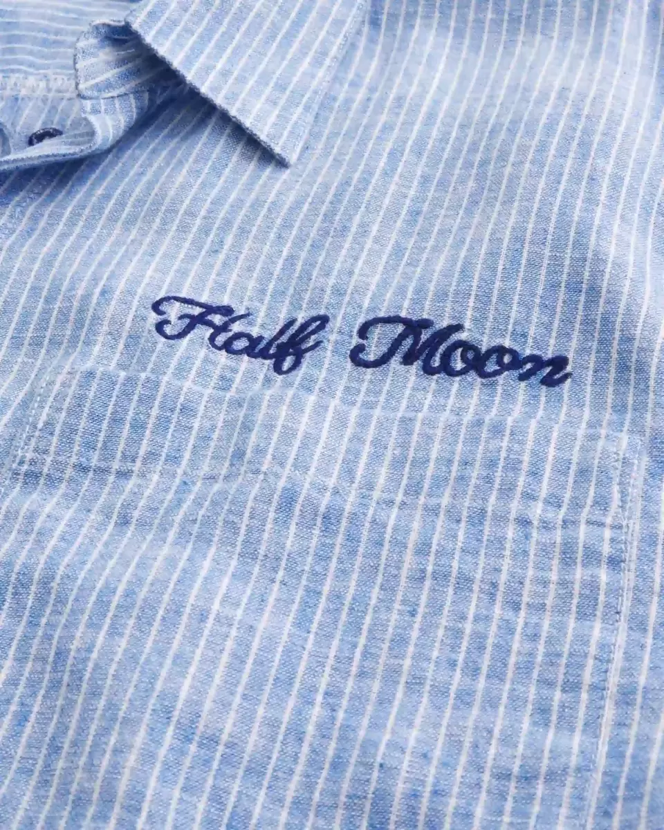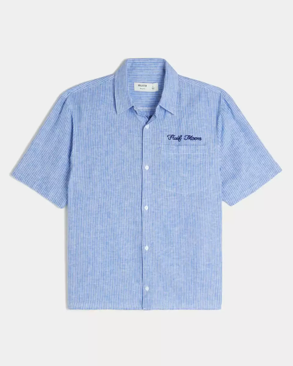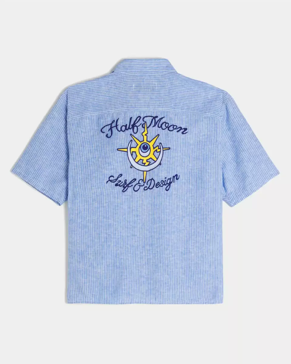 Denna klassiska skjortan är gjord i en mjuk linneblandning och har Half Moon-grafiskt broderi ovanför vänster bröstficka och baktill. Lägerkrage, korta ärmar, hel knappstängning. Boxig passform. Importerad.