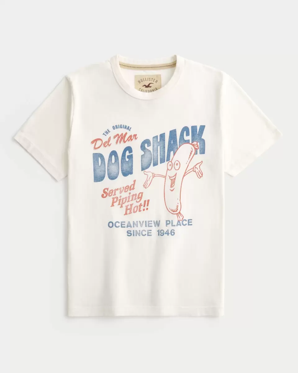 En supermjuk t-shirt med Del Mar Dog Shack-grafik. Rund halsringning, korta ärmar. Trendnedgång.