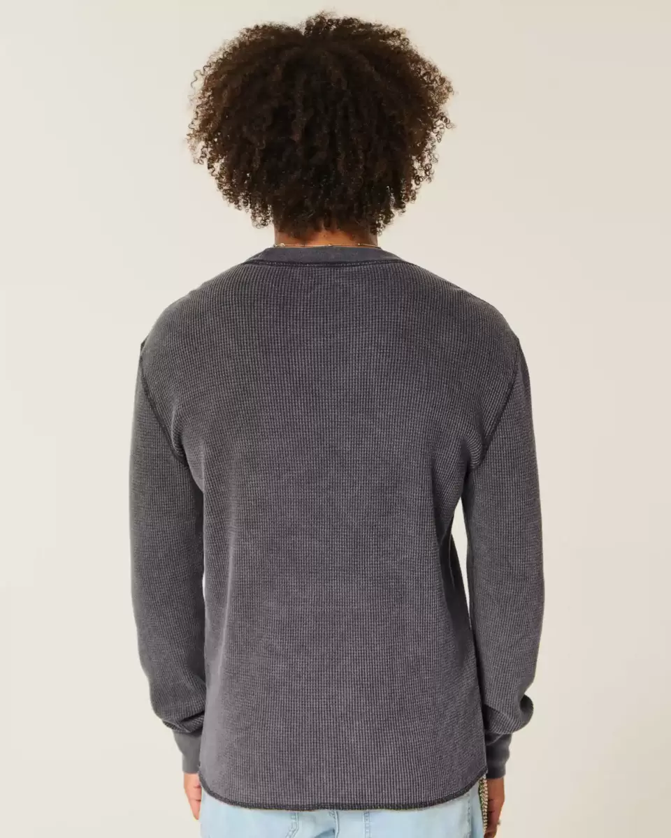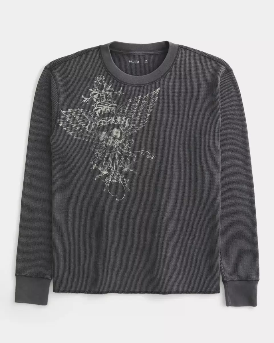 En långärmad Y2K-inspirerad termoskjorta i supermjukt våffeltyg. Crew urringning, dödskalle med vingar tryck grafik. Importerad.
