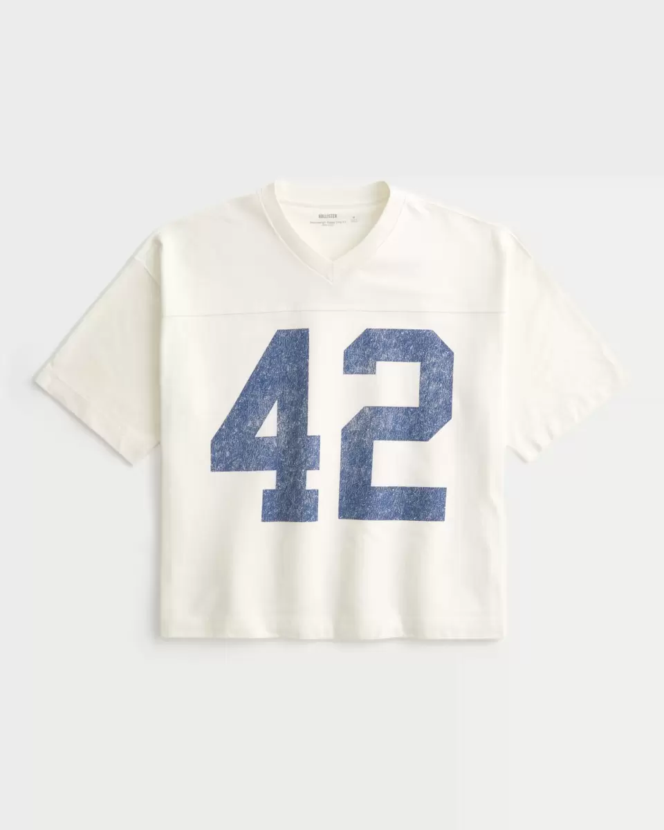 Denna supermjuka t-shirt är gjord av kraftig 100 % bomull och har en grafik med nummertryck i varsity-stil. V-ringning, korta ärmar. Baggy Crop Fit.