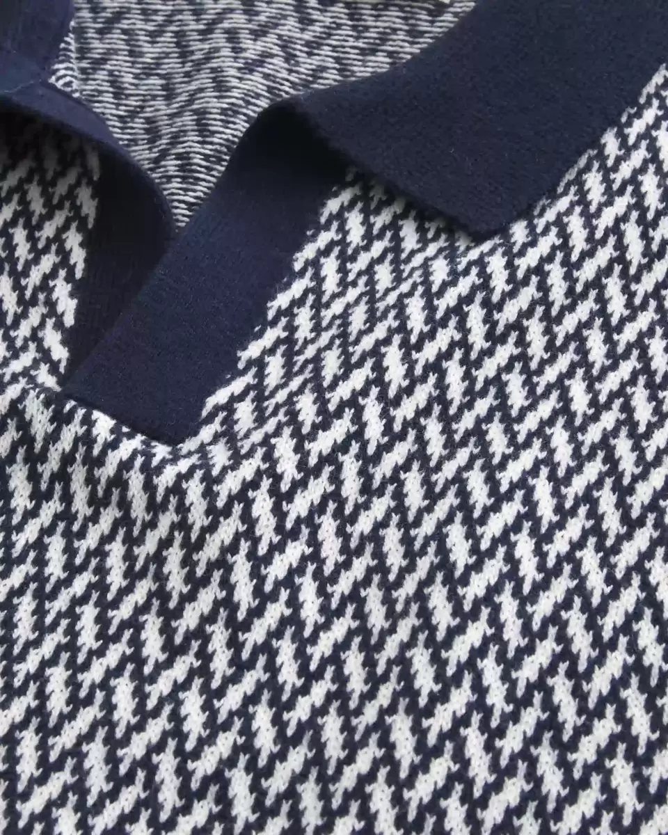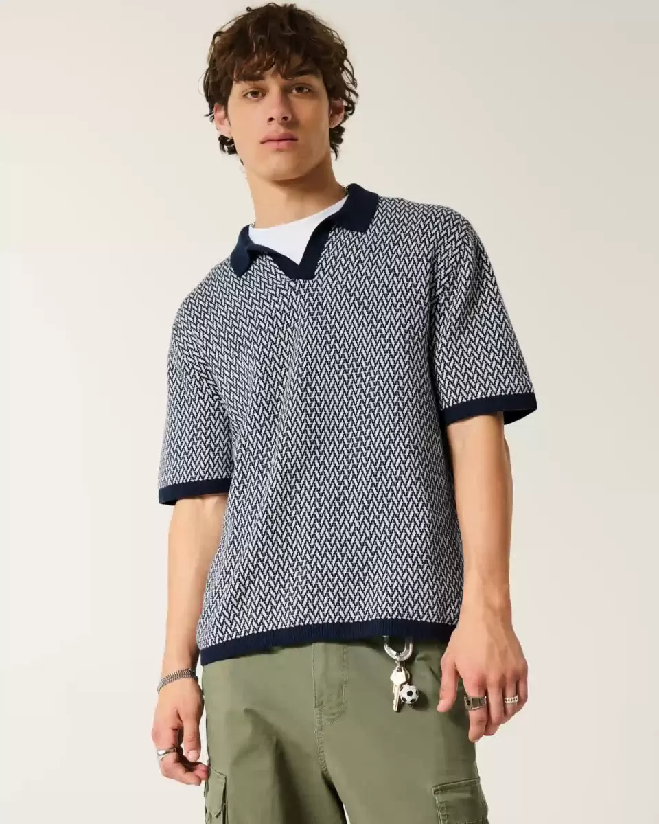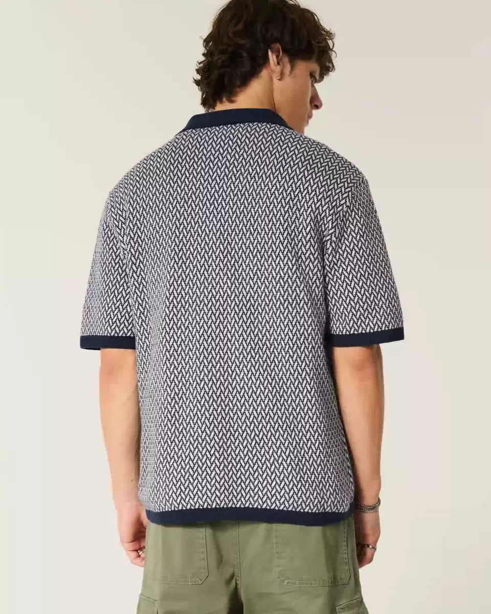 En supermjuk tröjastickad pikétröja med knappfri knappslå och korta ärmar. Klassiskt mönster. Boxig passform. Importerad.