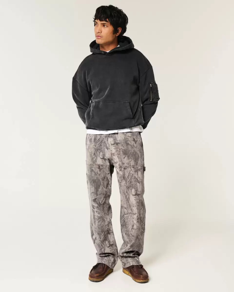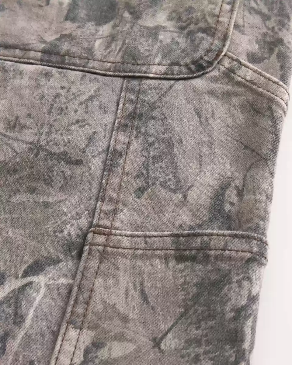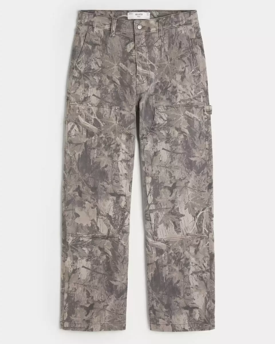 Klassiska jeans i snickarstil med ett heltäckande camomönster och påsiga ben. Förstärkta knäledssömmar, vänster ögledetalj, extra fickor. Importerad.