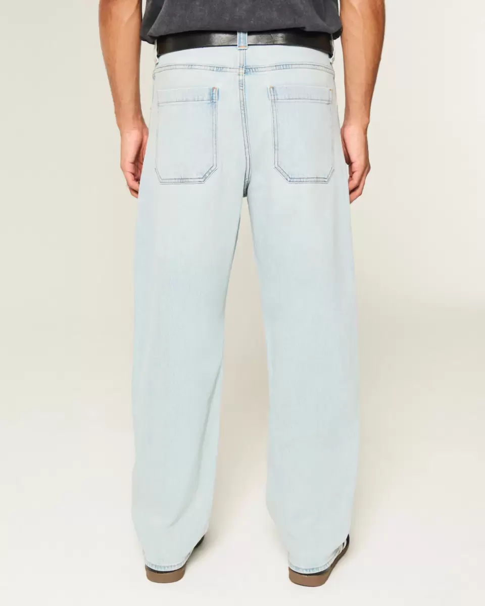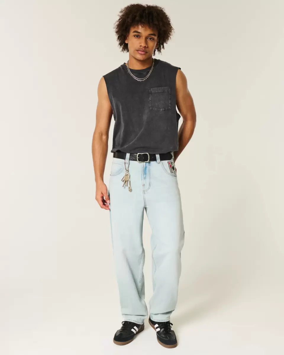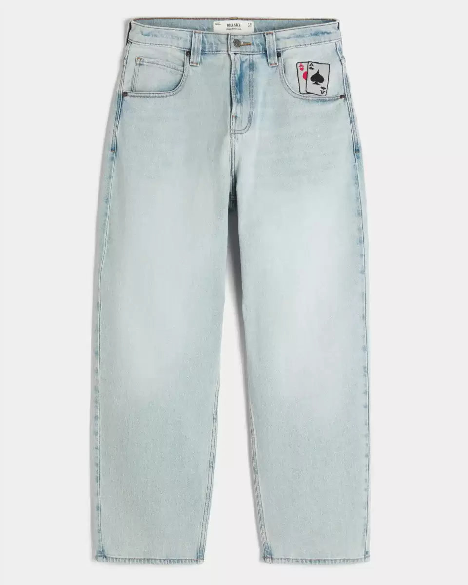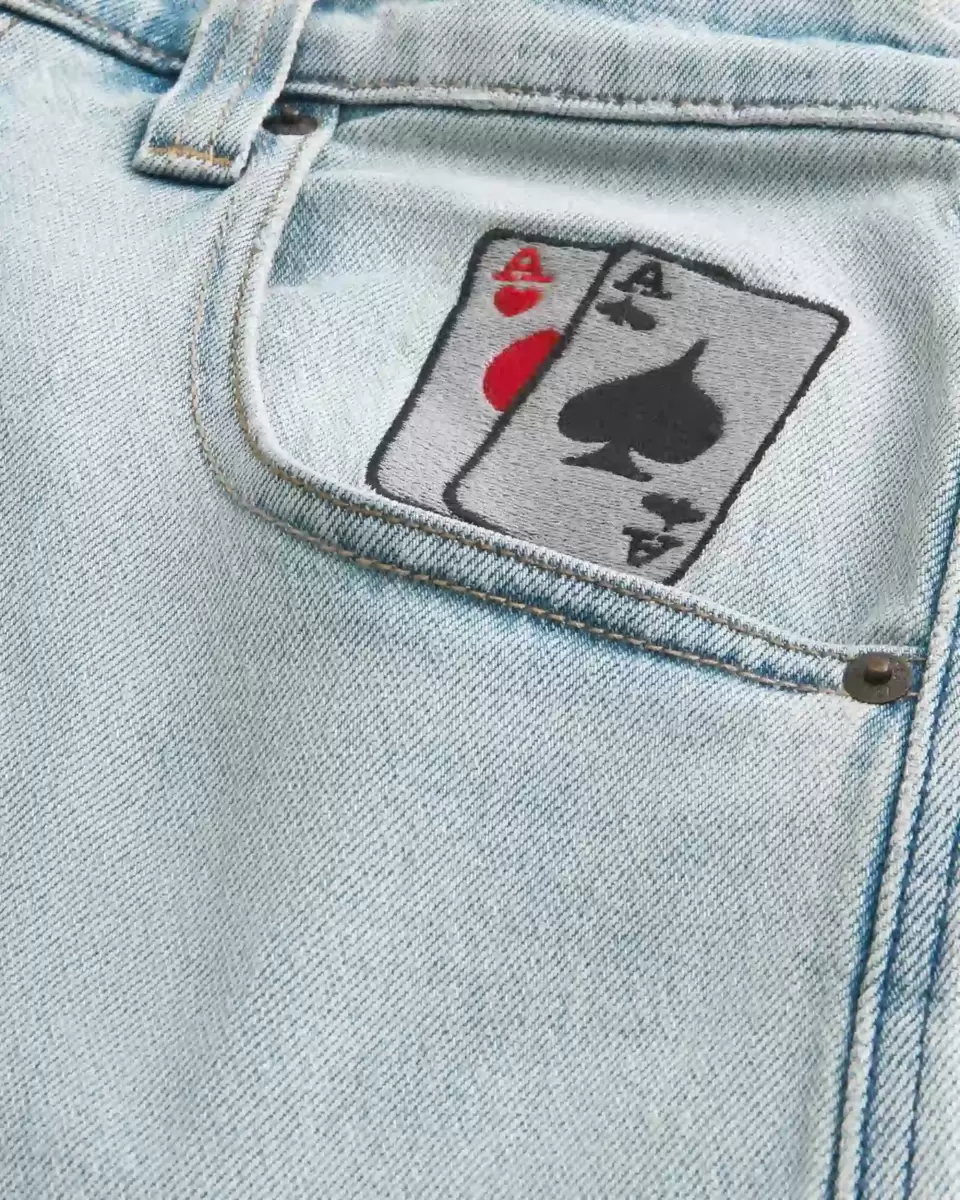 Bekväma skaterinspirerade denimjeans i lätt tvätt, designade med säckiga ben. Broderad spelkortsgrafik på vänster ficka, blekning, morrhår.