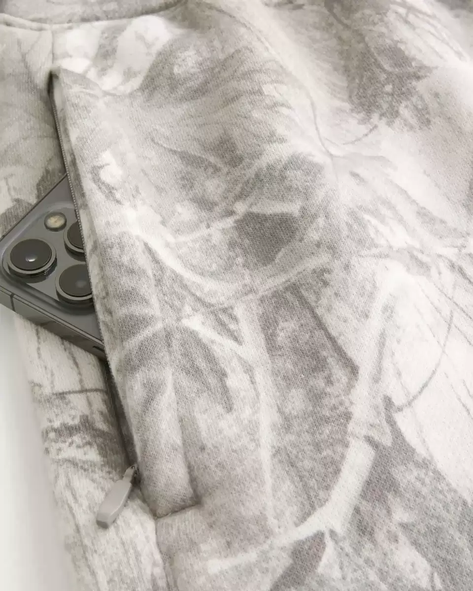 Supermjuka fleeceshorts designade med ett löst ben som träffar mitten av låret. Dragsko i midjan, fickor, höger ficka med blixtlås, camomönster heltäckande, broderad logotyp i vänster fåll. Importerad.