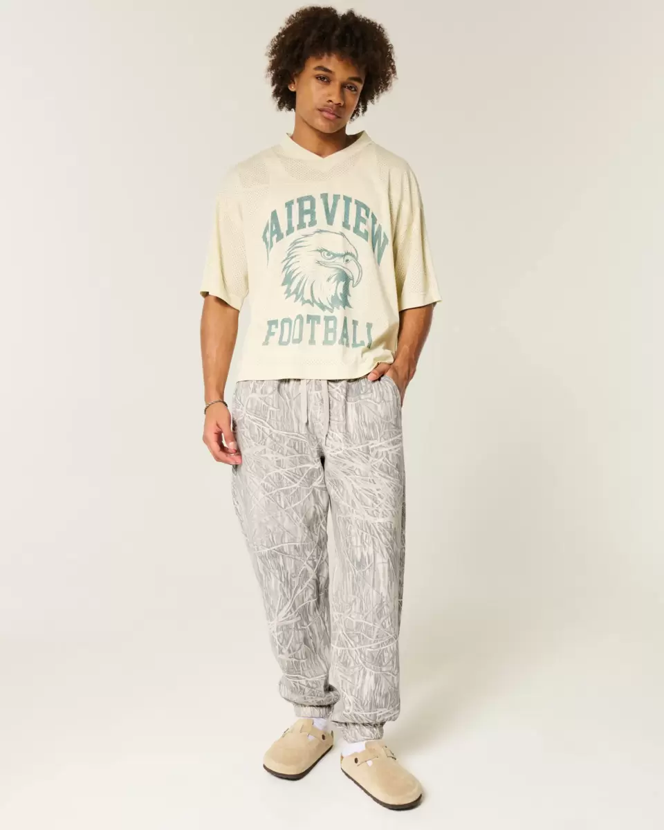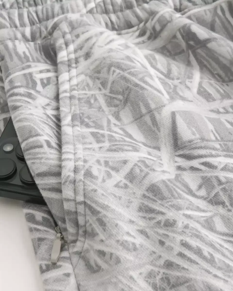 Supermjuka joggingbyxor i fleece designade med säckiga ben och knäppkant. Heltäckande camouflagemönster, fickor, höger ficka med dragkedja, dragsko i midjan, heltäckande camouflagemönster. Importerad.