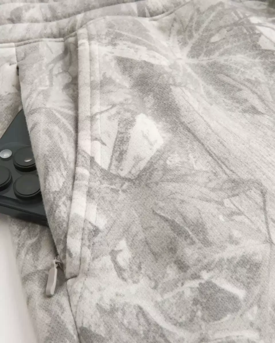 Supermjuka träningsbyxor i fleece designade med ett skåra ben. Fickor, höger ficka med dragkedja, dragsko i midjan, camomönster överallt. Importerad.