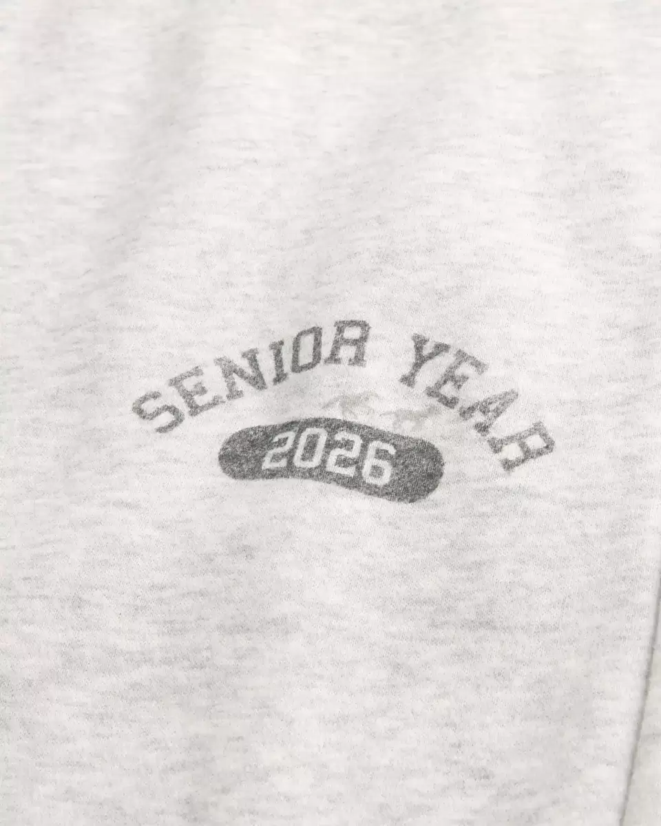 Supermjuka träningsbyxor i fleece med grafik från Senior Year 2026. Dragsko i midjan, fickor, höger ficka med dragkedja, superbaggy ben. Importerad.