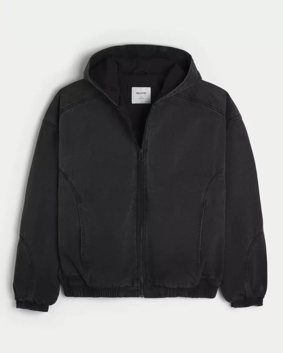 En jeansjacka i tvättad svart, med hel dragkedja, fickor fram och huva. Sömdetaljer, snärjda fållar. Importerad.
