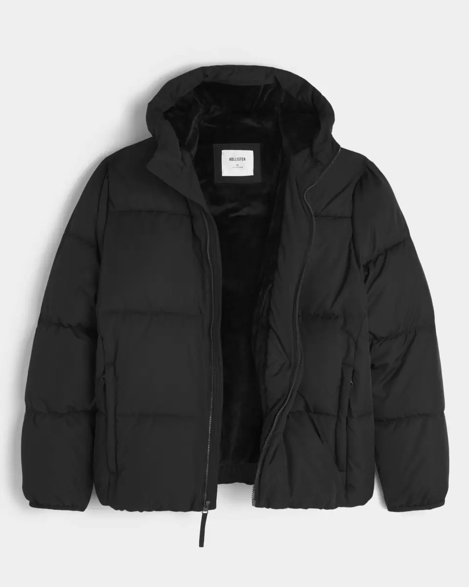 En tung, fuskpälsfodrad pufferjacka designad med breda quiltade kanaler, full dragkedja och framfickor med blixtlås. Huva med fuskpälsfodrad. Importerad.