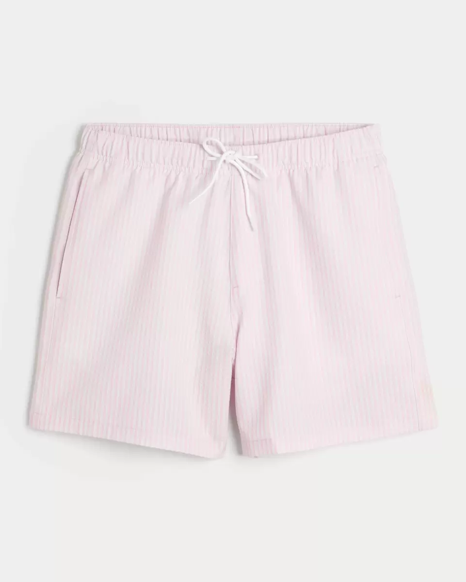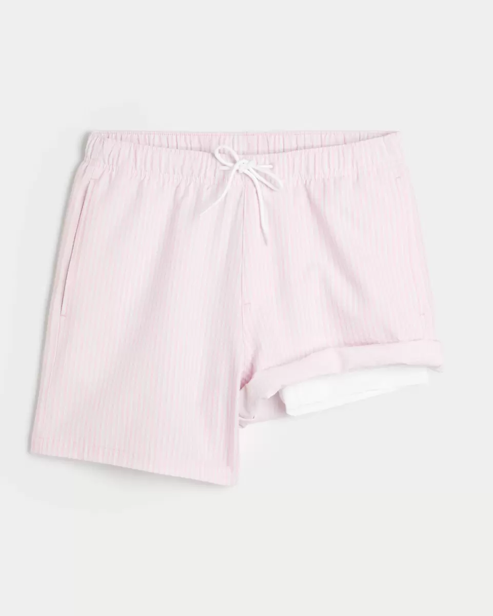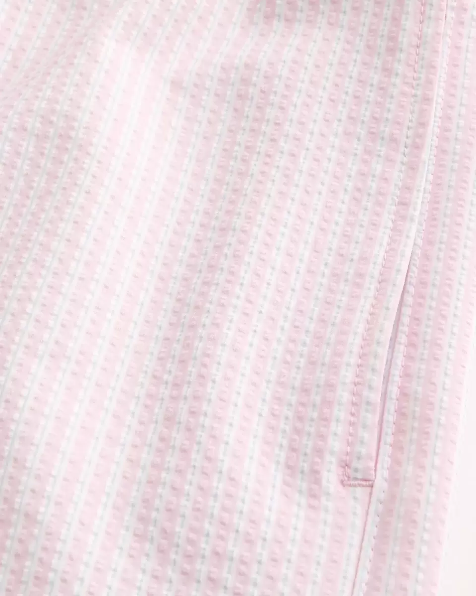 Kortare badbyxor som träffar mitten av låret. Med bekvämt 4-vägs stretch seersucker simtyg och en 6″ innersöm. Framfickor, meshfoder. Importerad.