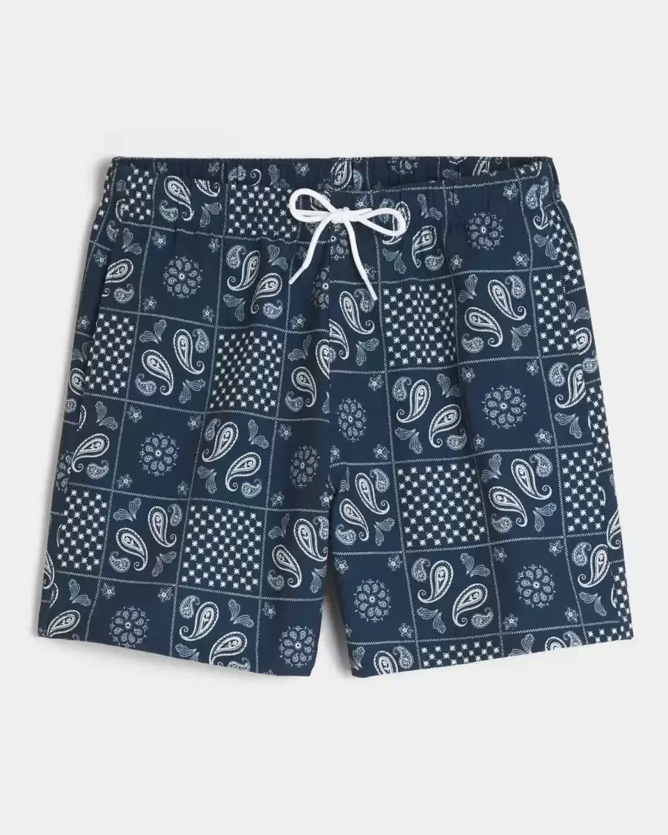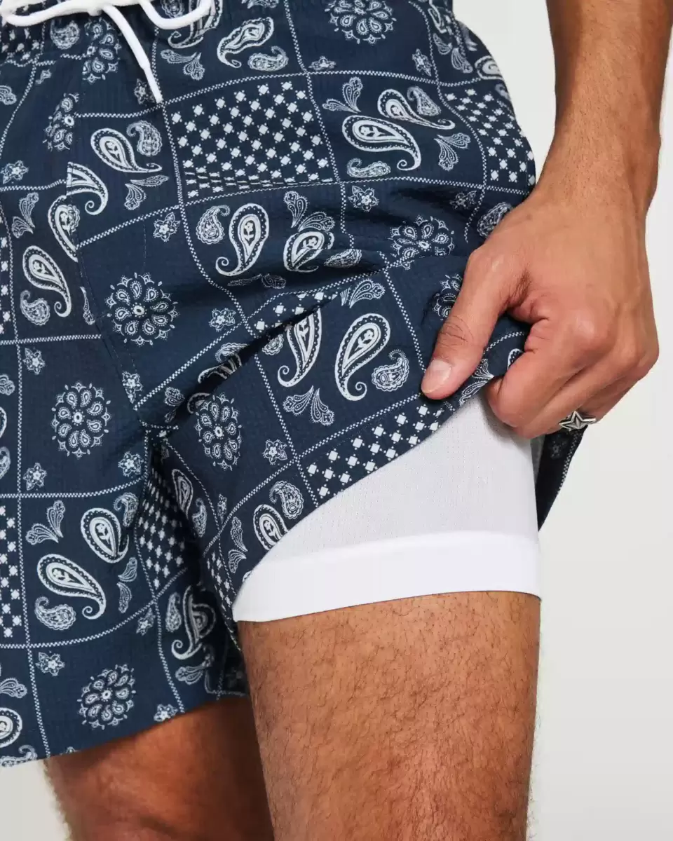 Kortare badbyxor som träffar mitten av låret. Med bekvämt 4-vägs stretch seersucker simtyg och en 6″ innersöm. Framfickor, meshfoder. Importerad.