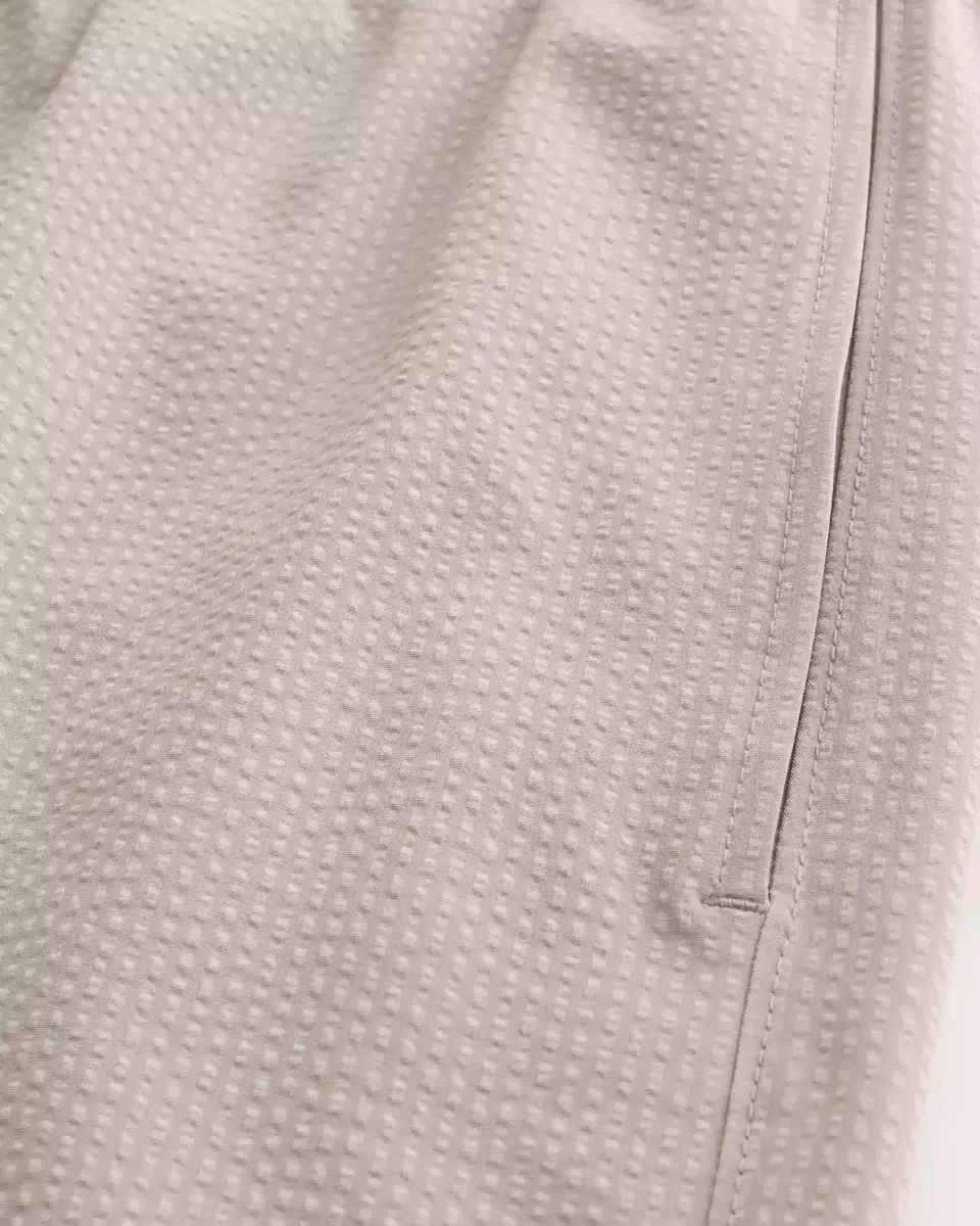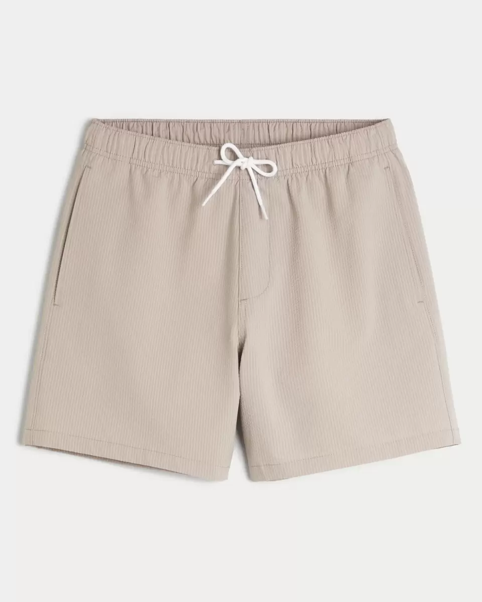 Kortare badbyxor som träffar mitten av låret. Med bekvämt 4-vägs stretch seersucker simtyg och en 6″ innersöm. Framfickor, meshfoder. Importerad.