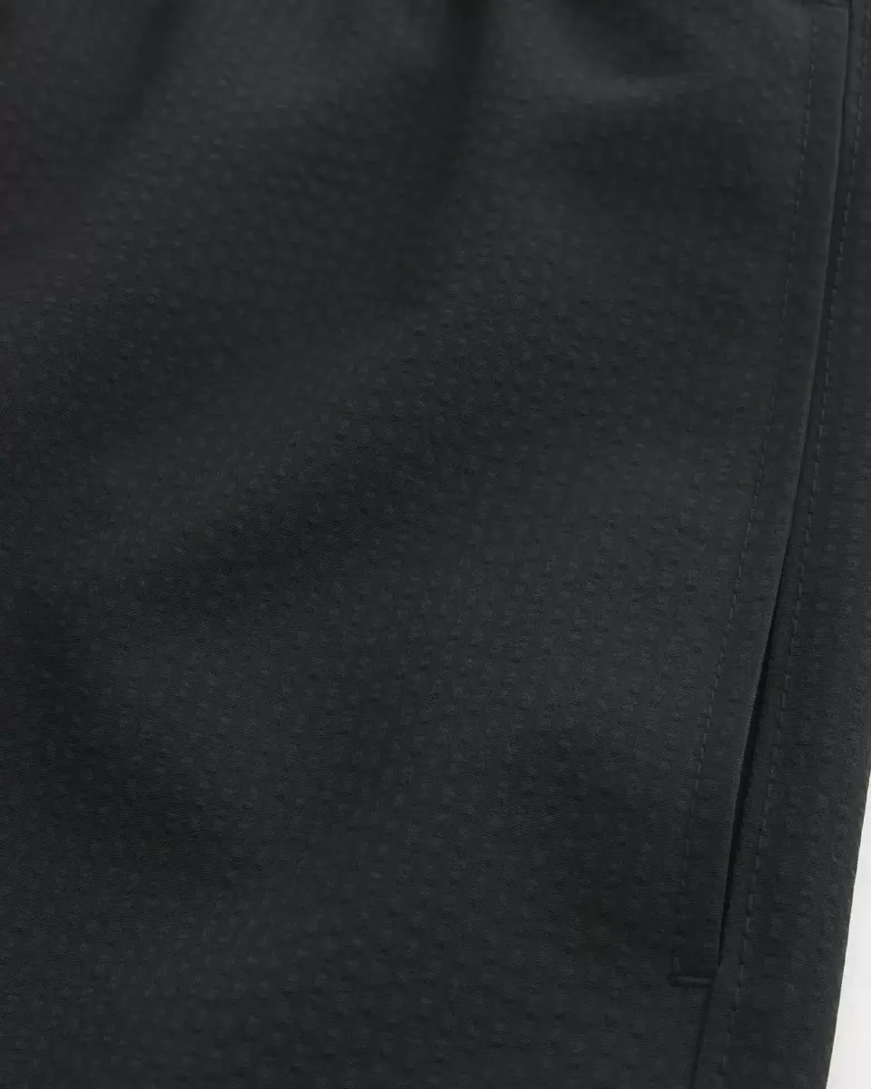 Kortare badbyxor som träffar mitten av låret. Med bekvämt 4-vägs stretch seersucker simtyg och en 6″ innersöm. Framfickor, meshfoder. Importerad.