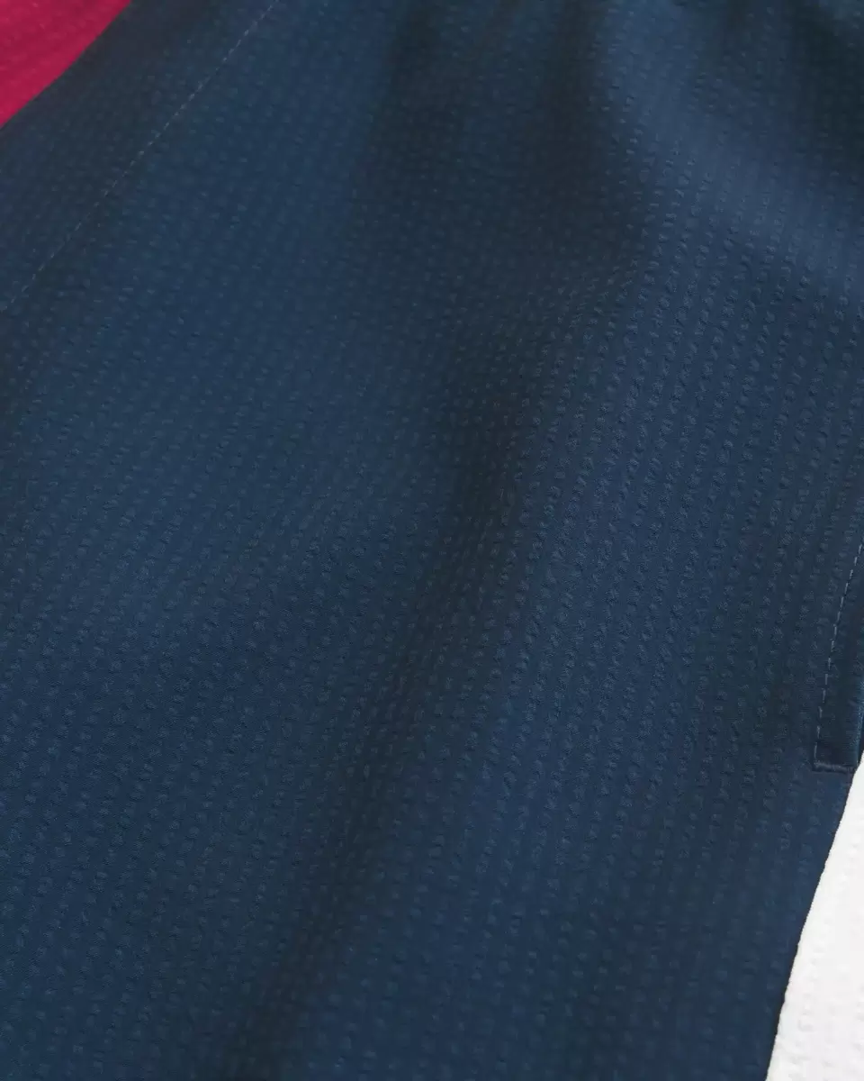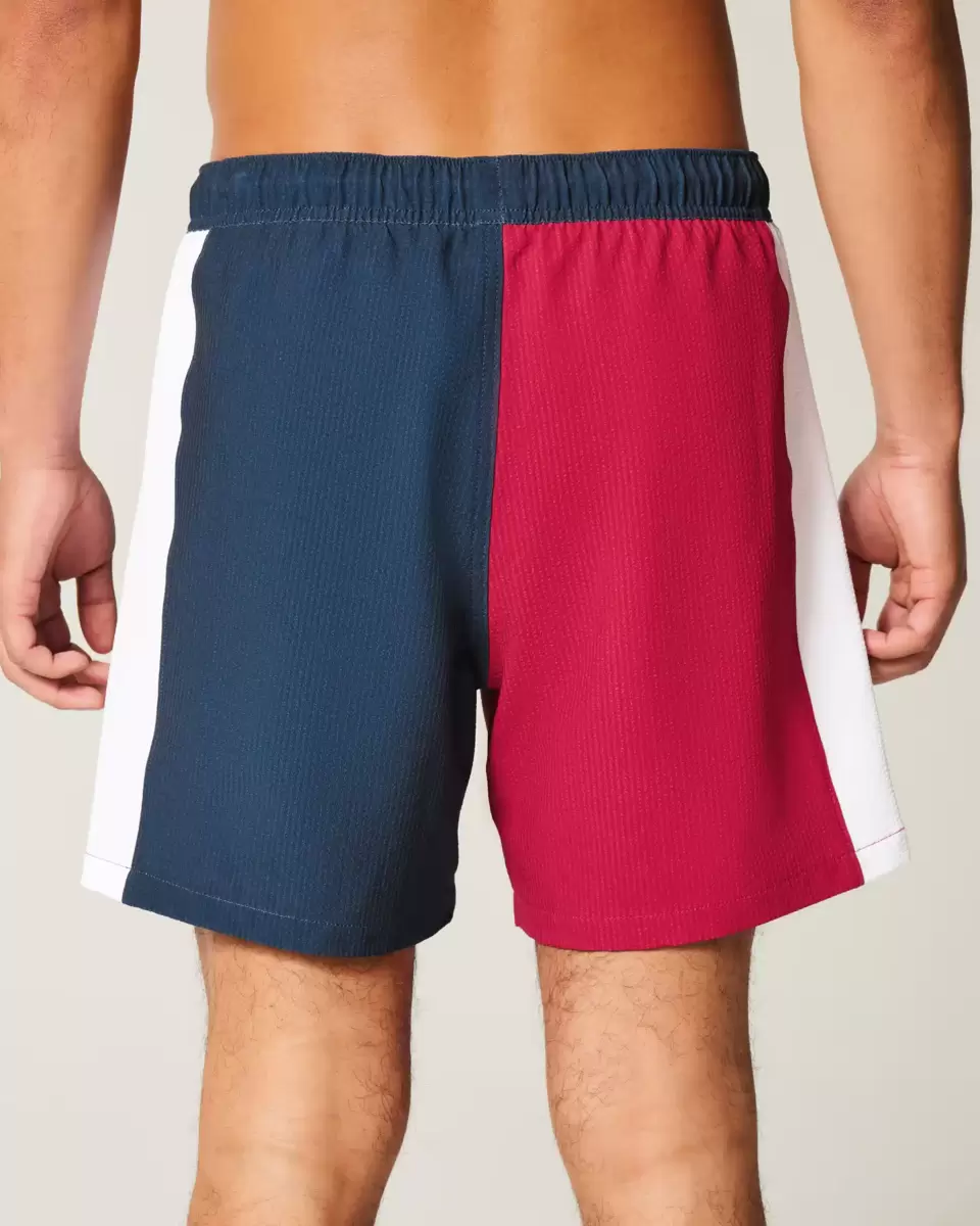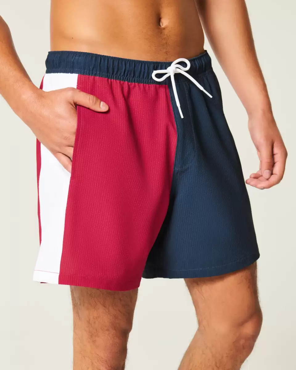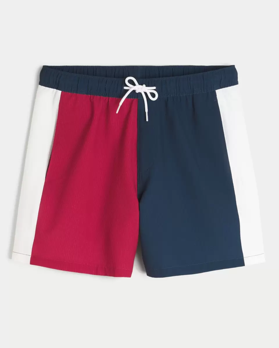 Kortare badbyxor som träffar mitten av låret. Med bekvämt 4-vägs stretch seersucker simtyg och en 6″ innersöm. Framfickor, meshfoder. Importerad.