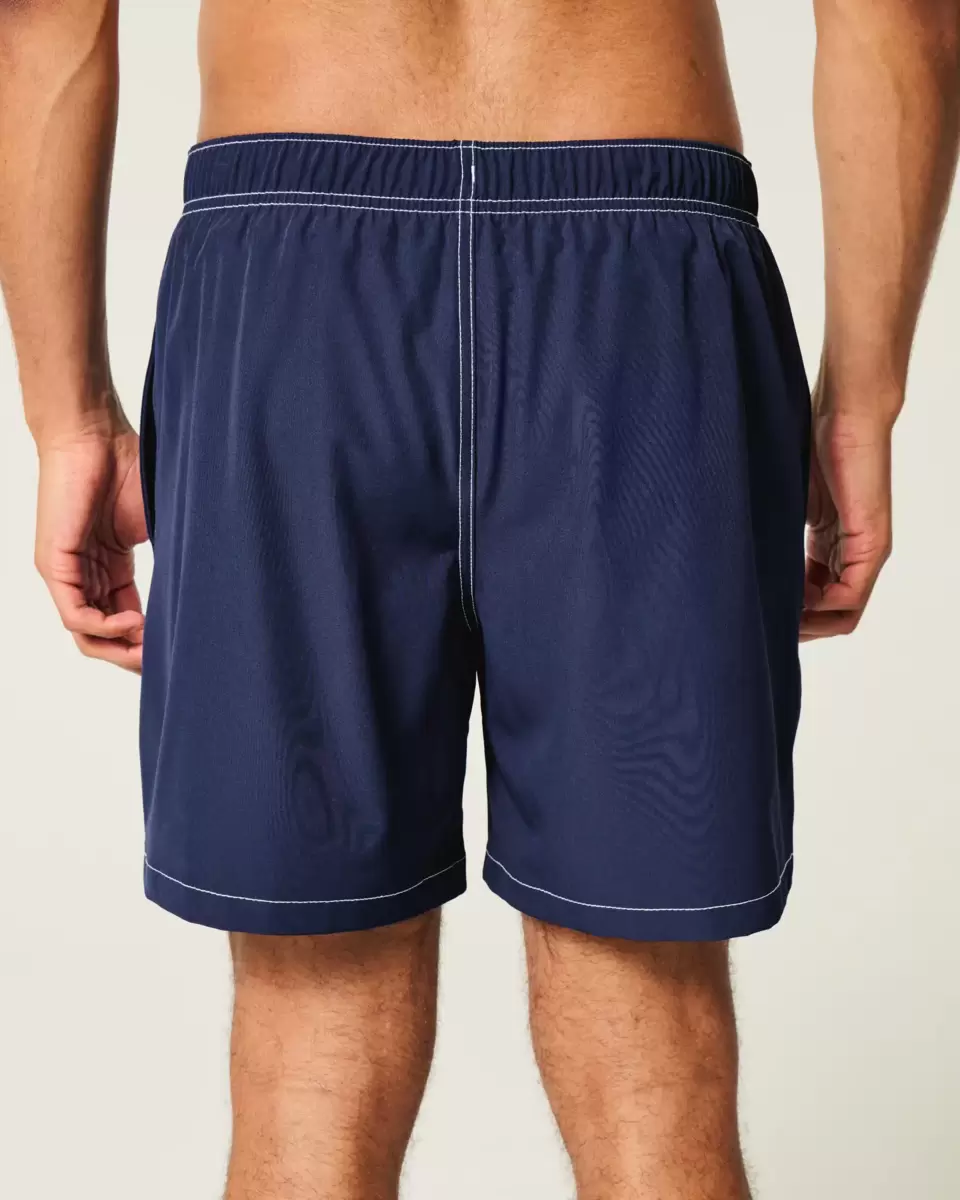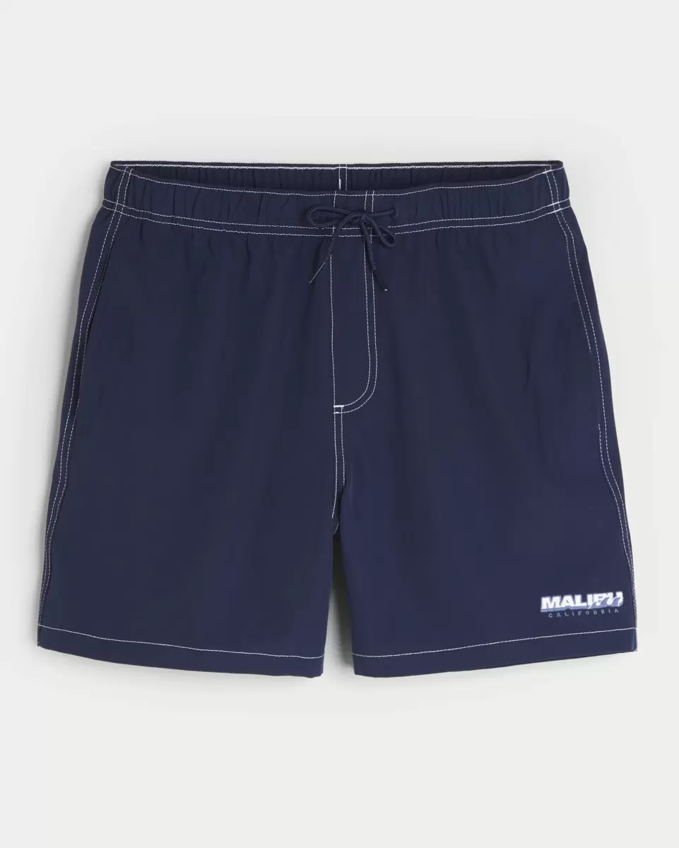 Kortare badbyxor som träffar mitten av låret. Med bekvämt 4-vägs stretchigt simtyg och en 6″ innersöm. Fickor, kontrastsömmar, broderad Malibu California-detalj. Importerad.