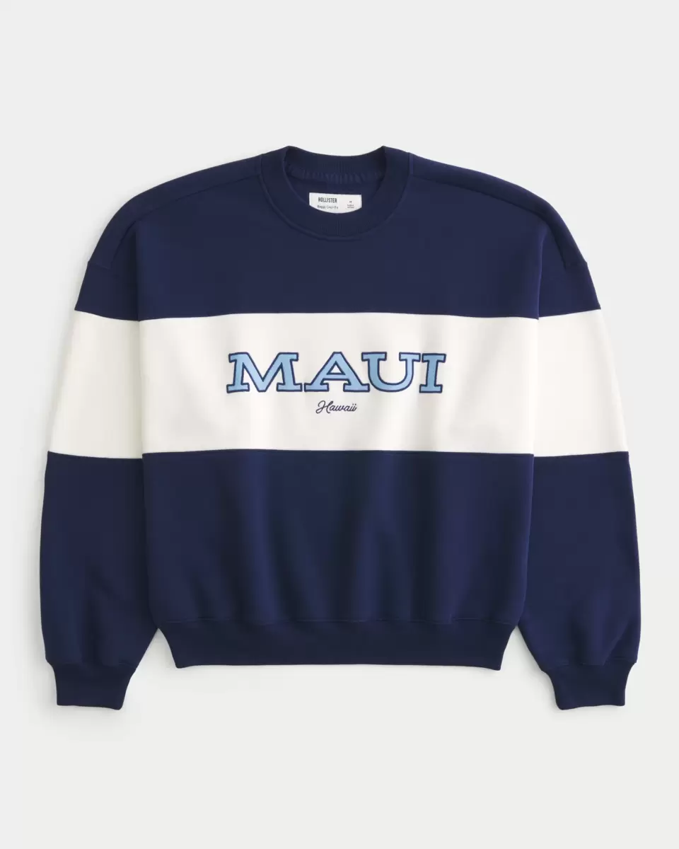 Denna supermjuka fleecetröja har Maui Hawaii grafiska broderier och applikationer. Rund halsringning, långa ärmar. Baggy Cinch Fit. Importerad.
