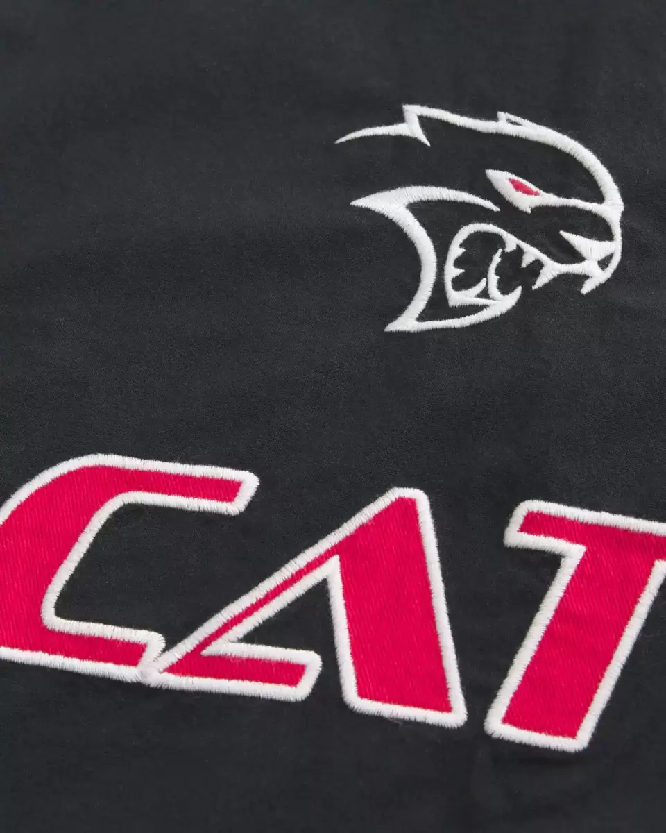 En klassisk skjorta i arbetsklädesstil med korta ärmar och hel knappstängning. Officiellt licensierad Dodge Hellcat grafiskt broderi fram och bak, krage, korta ärmar. Boxy F
