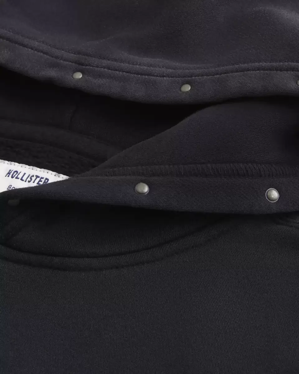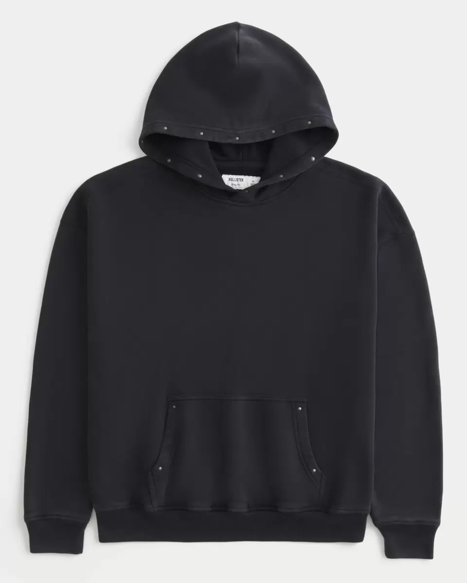 En supermjuk luvtröja i fleece med nitar på framfickan och huvan. Långa ärmar. Boxig passform. Importerad.