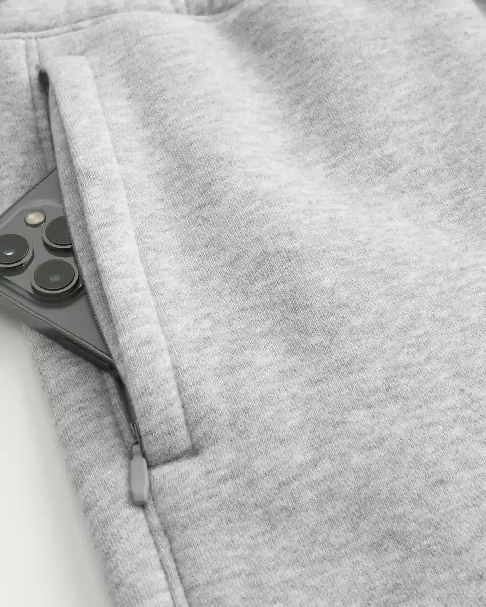 Supermjuka joggingbyxor i fleece med dragsko i midjan och bandade fållar. Broderad logotyp ikon nära midjan, fickor, höger blixtlåsficka.
