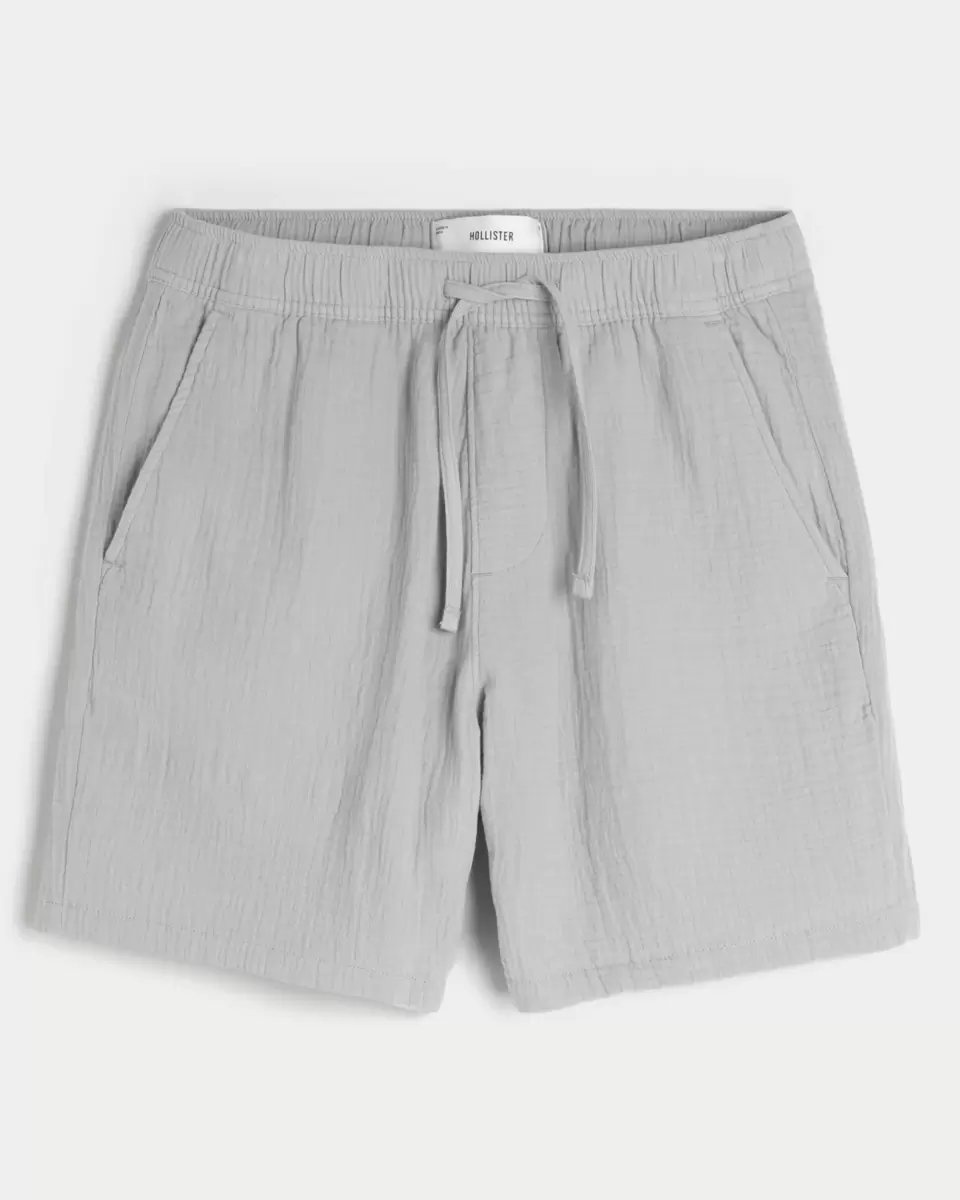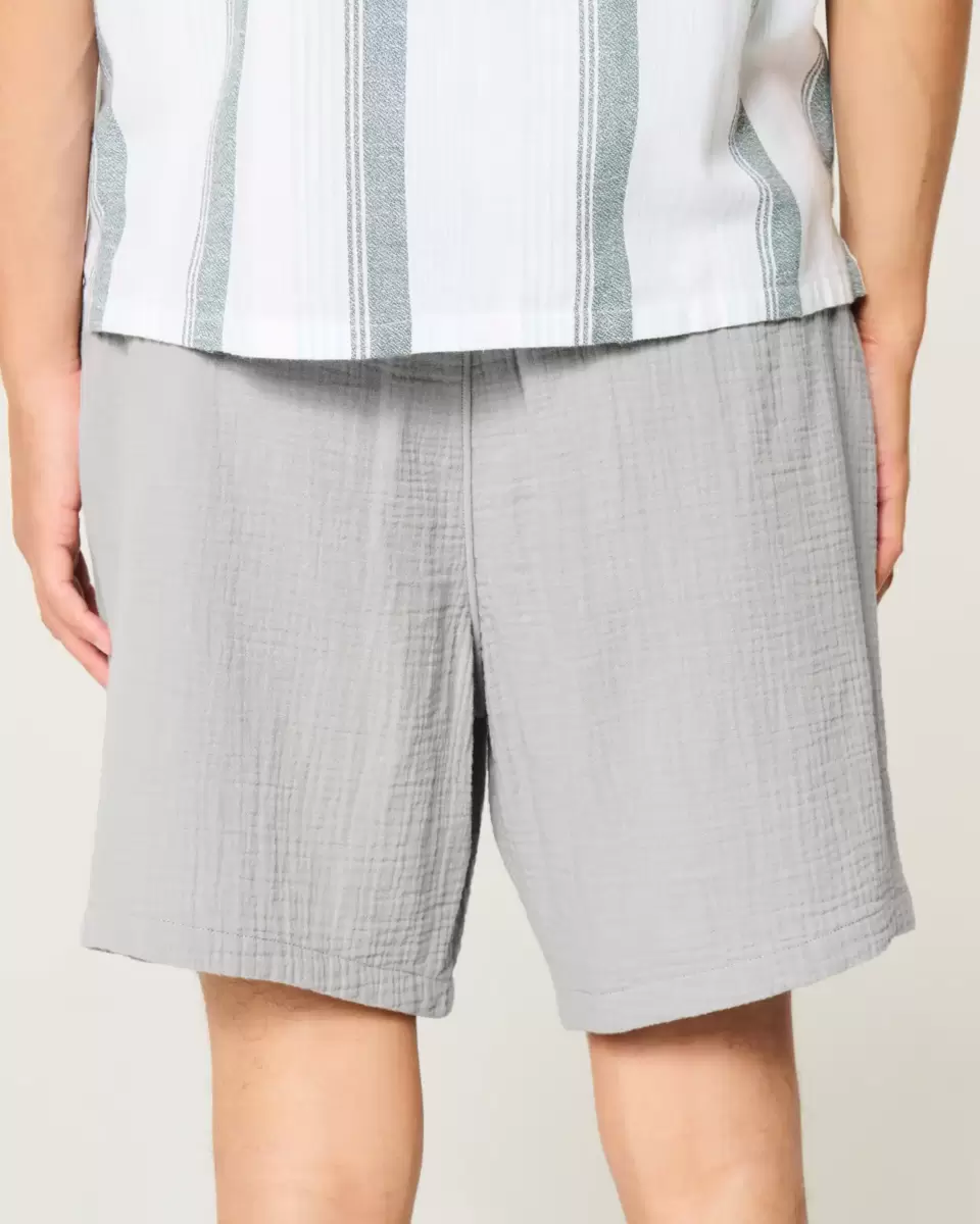 Ultrabekväma shorts i mjukt krinklet bomullstyg. Dragsko i midjan, fickor, 8″ innersöm, träffar ovanför knäet. Importerad.