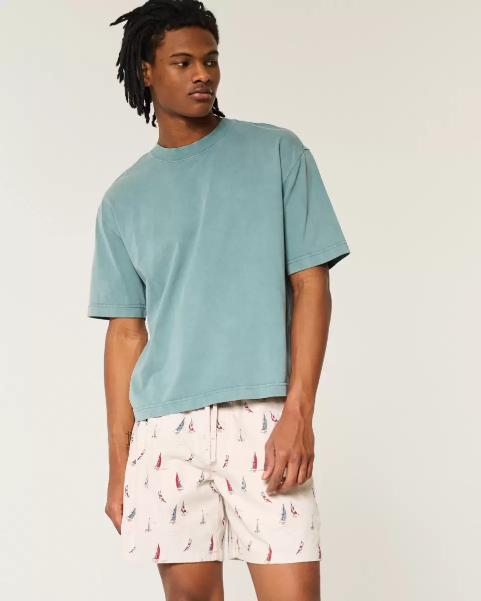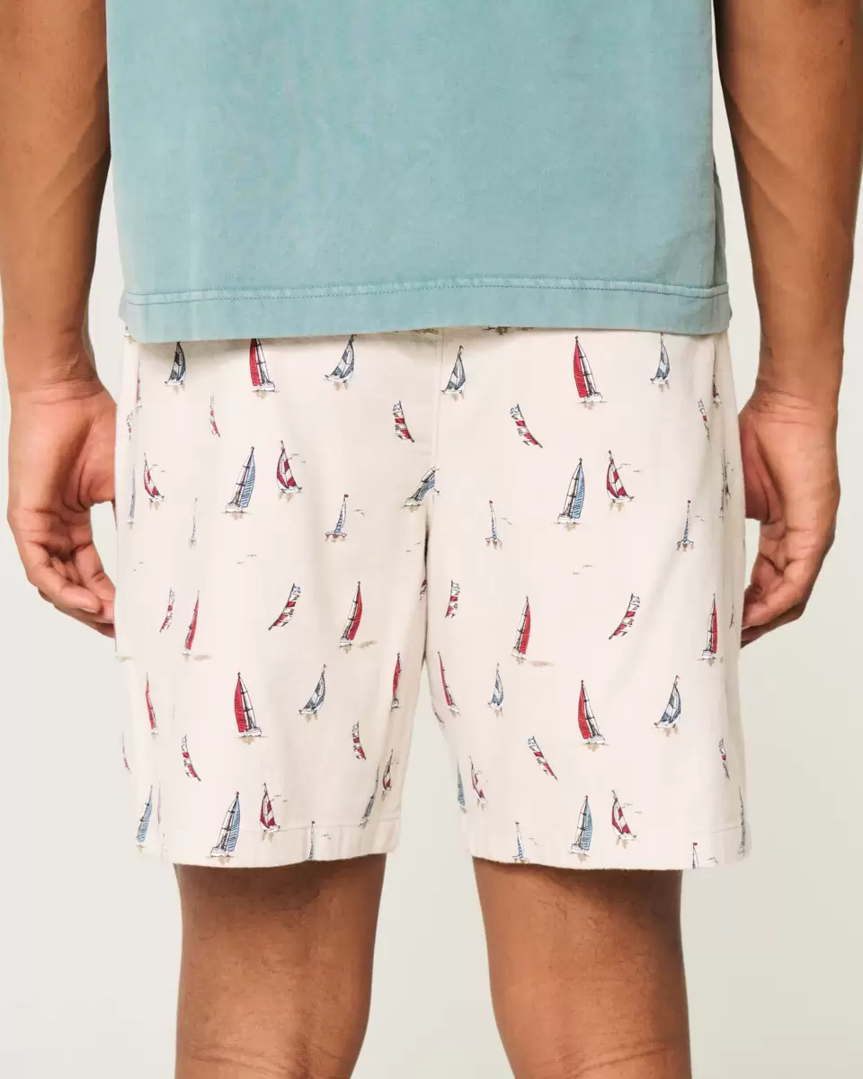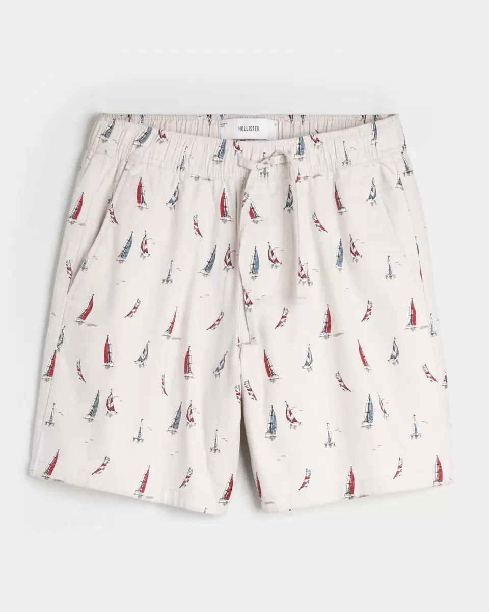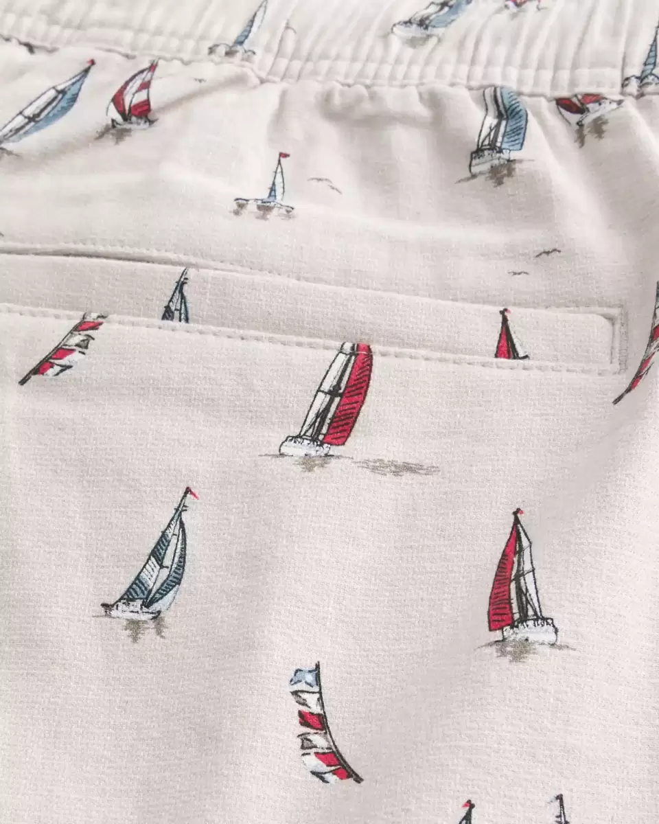 Ultrabekväma shorts med dragsko i midjan och segelbåtsmönster. Fickor, träffar ovanför knäet. Importerad.
