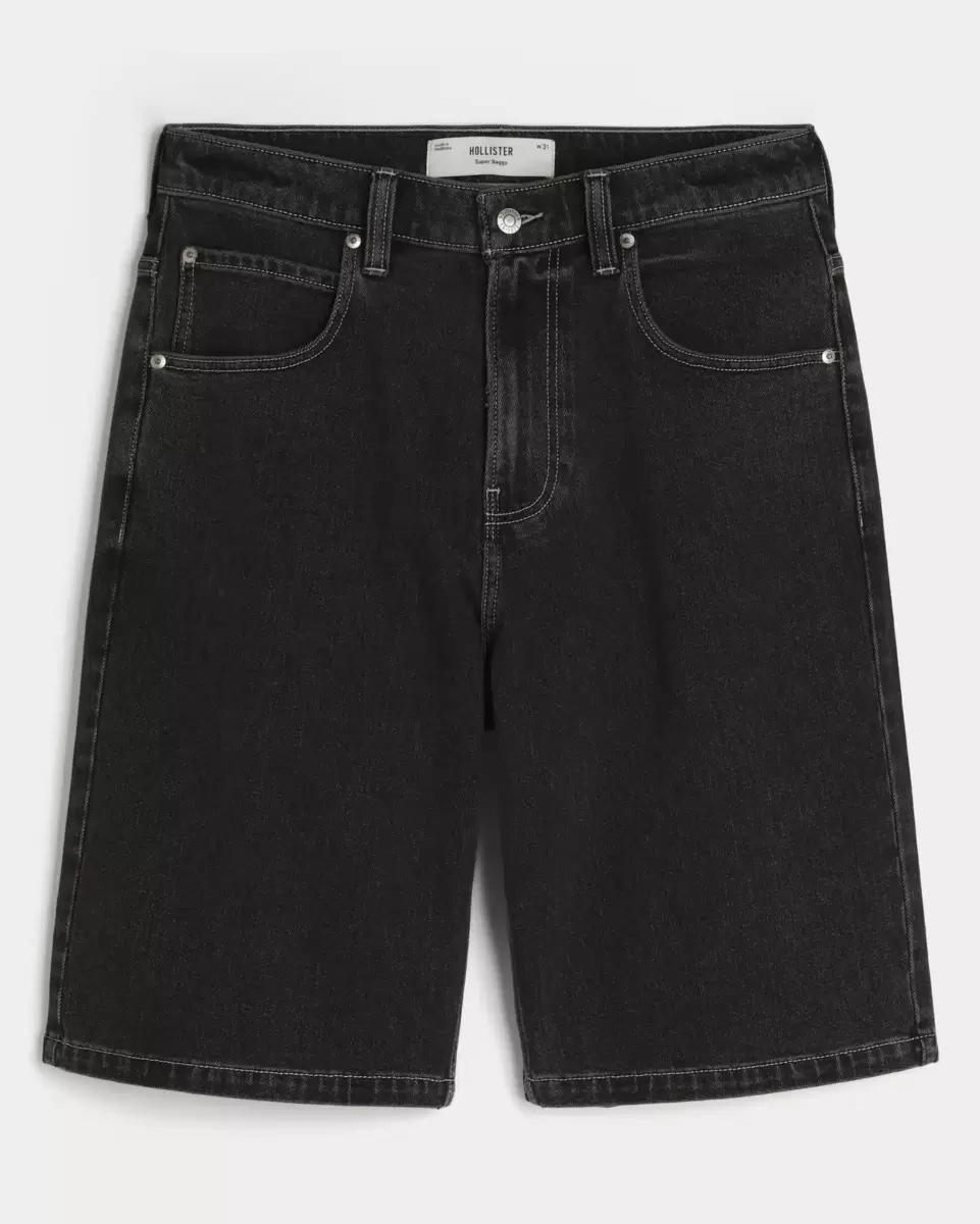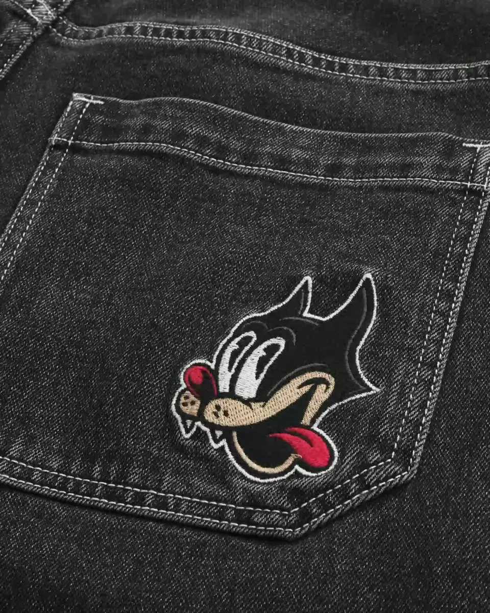 Bekväma jeansshorts i tvättad svart, designade med ett superbaggy ben som träffar under knäet. Broderad kattgrafik på bakfickan. Importerad.