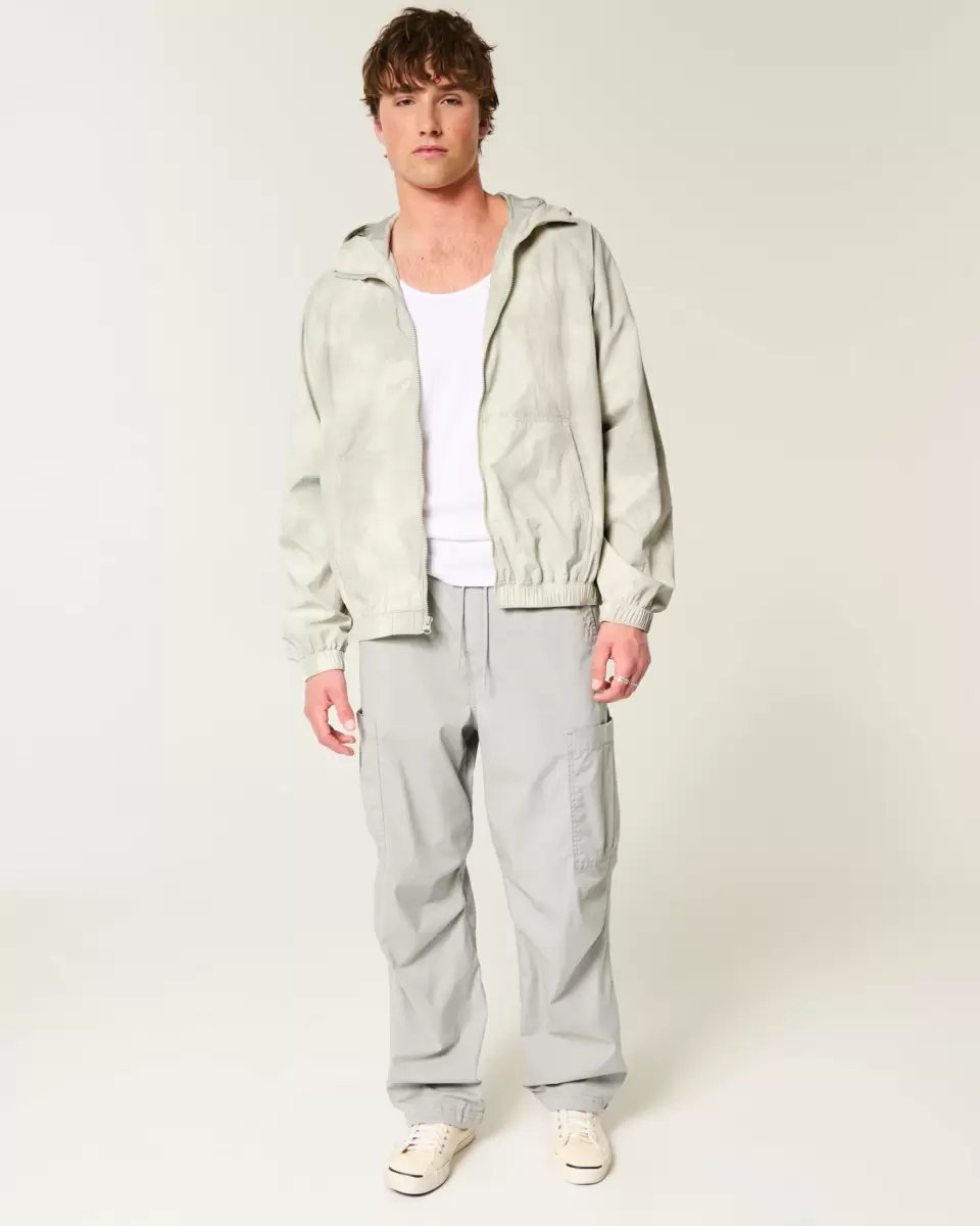 En klassisk vindjacka med hel dragkedja och ett heltäckande camomönster. Framfickor, huva. Importerad.